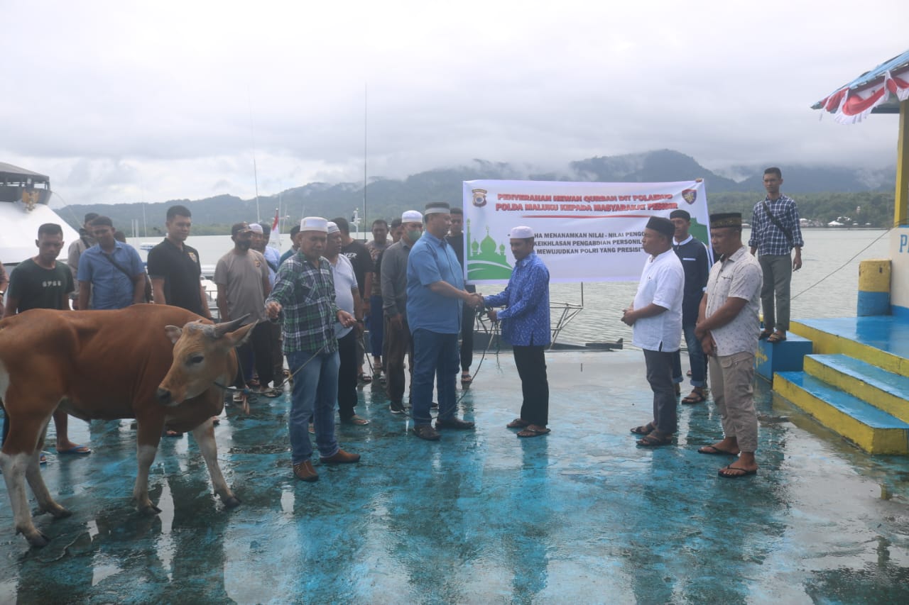 Masarikuonline.Com, Ambon, – Direktur Polairud Polda Maluku, Kombes Pol Harun Rosyid SIK, menyerahkan bantuan hewan kurban kepada masyarakat pesisir.