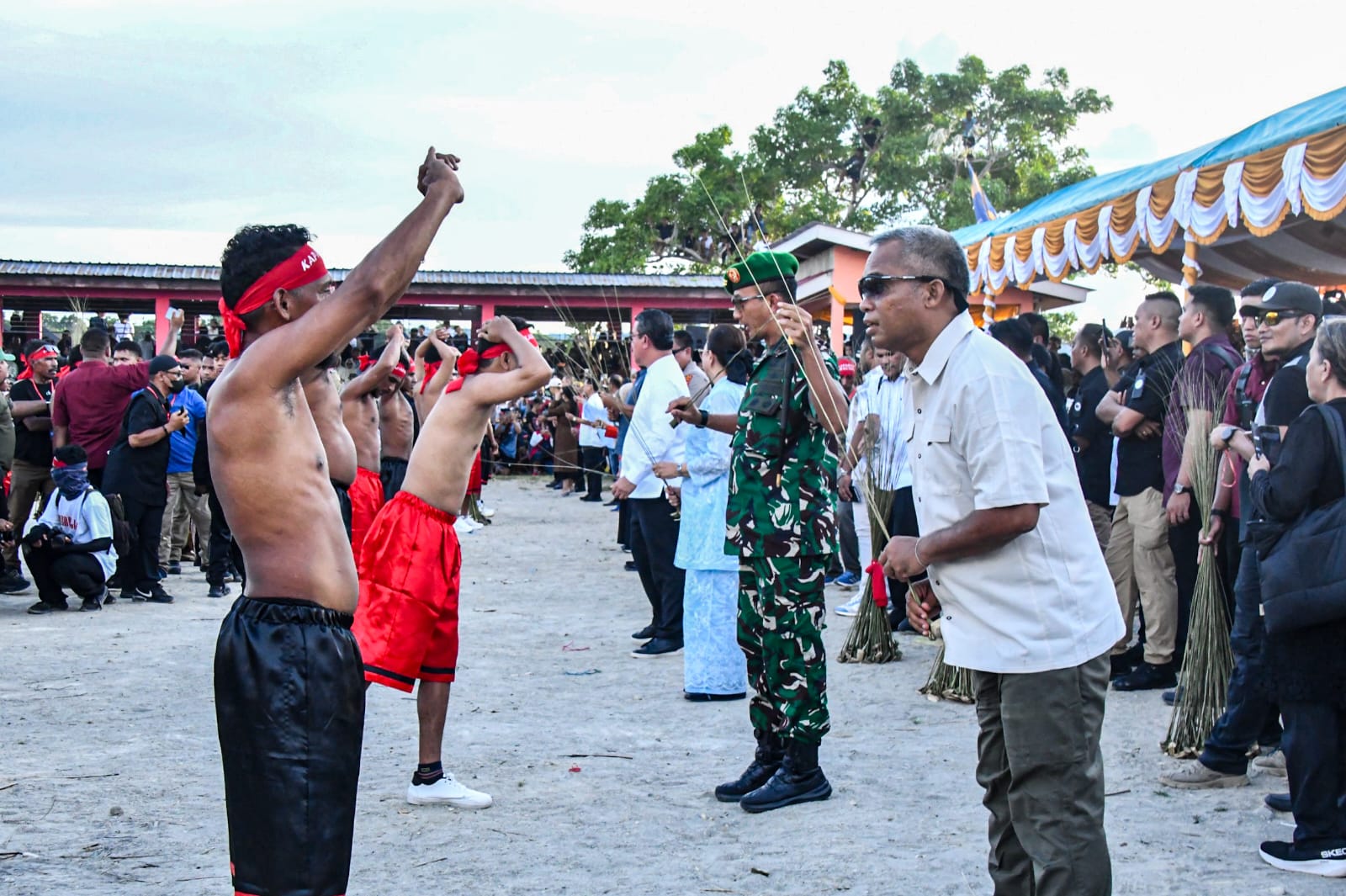 Dalam atraksi ini, para peserta saling berhadapan dan memukul tubuh menggunakan sapu lidi, namun tetap dalam aturan adat yang ketat serta diawasi oleh tetua adat. Meski terlihat ekstrem, tradisi ini sarat makna sebagai simbol keberanian, ketangguhan, serta semangat persaudaraan.
