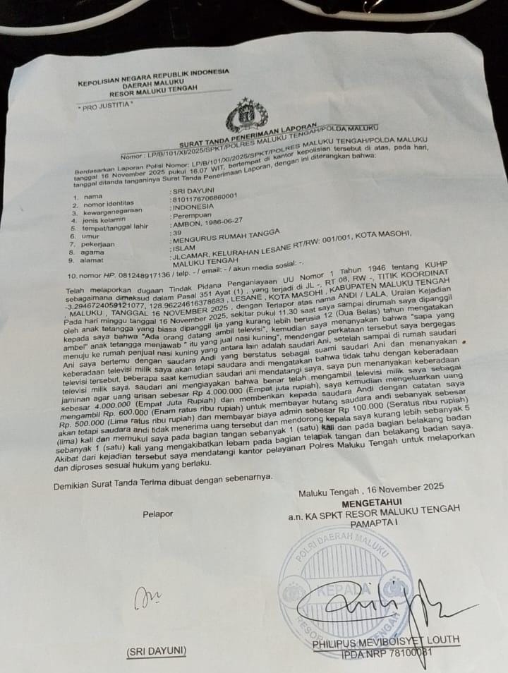Polres Maluku Tengah telah menerima laporan tersebut dan akan memprosesnya sesuai dengan hukum yang berlaku. (*Tim